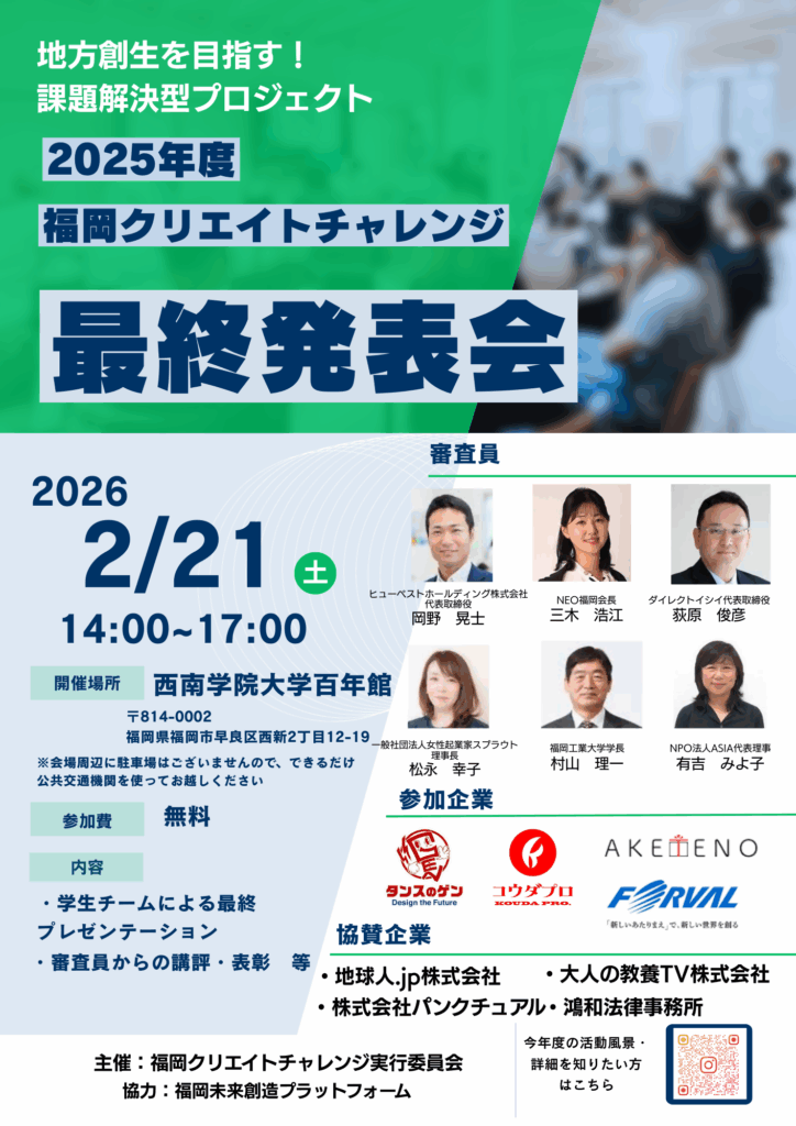 福岡県内の大学生が地域企業の課題解決に挑む産学連携プロジェクト「福岡クリエイトチャレンジ」最終発表会を開催いたします。