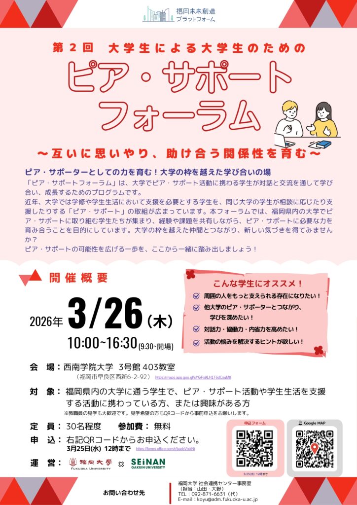 福岡都市圏の12大学が参画する「福岡未来創造プラットフォーム」の主催で、「ピア・サポートフォーラム~互いに思いやり、助け合う関係性を育む~」を開催します。