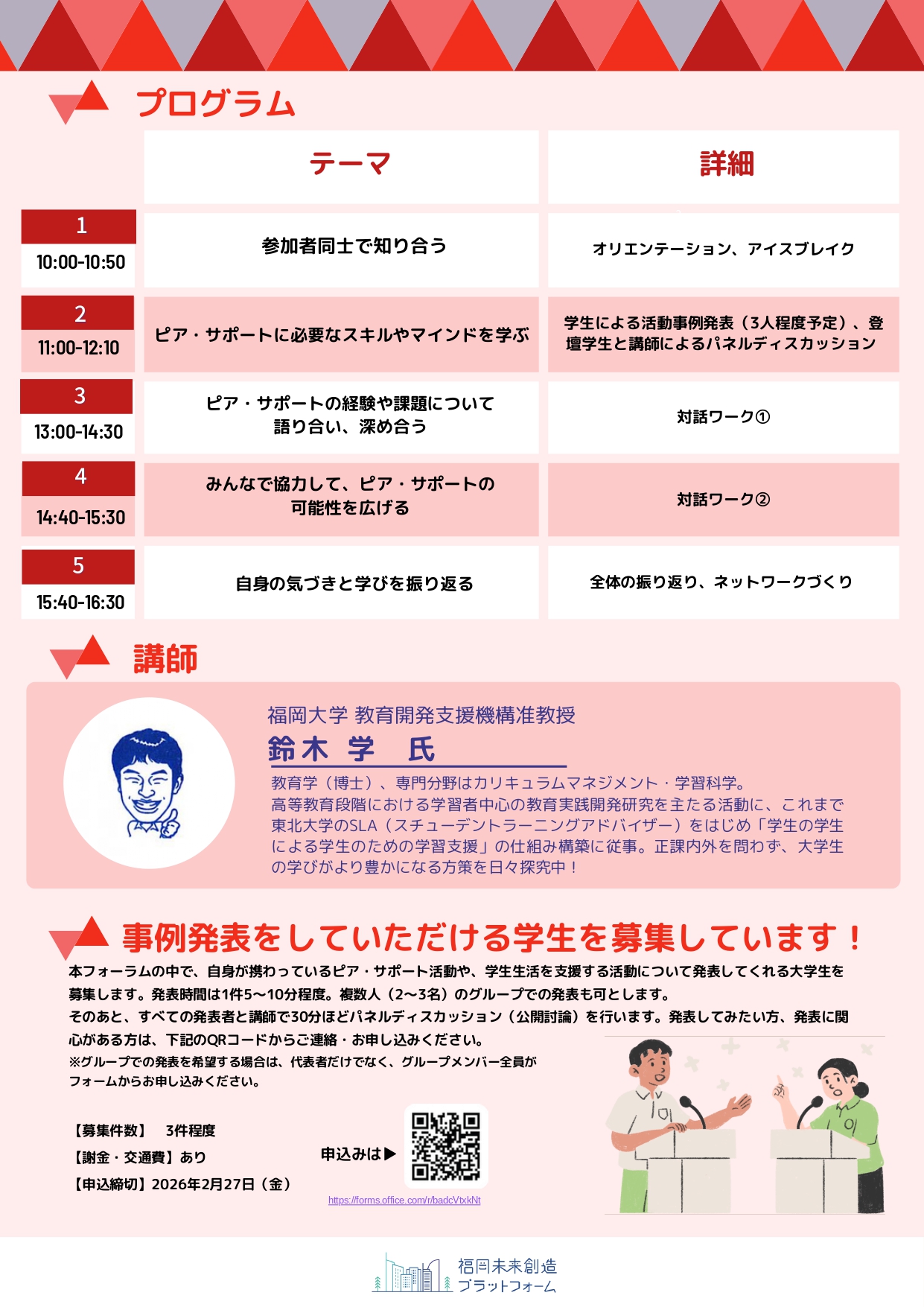 【対 象】福岡県内の大学に通う学生で、ピア・サポート活動や学生生活を支援する活動に携わっている方、または興味がある方