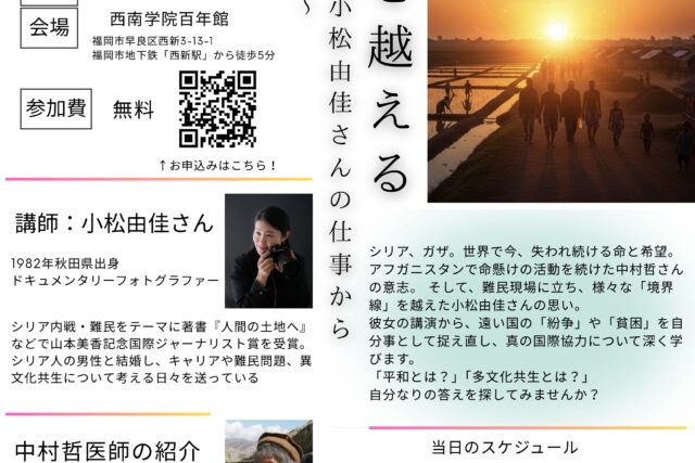 このたび、故中村哲医師の志を継承することを目的として活動する「哲縁会」と、国内外でワークキャンプを行う「FIWC九州」が共同でトークイベントを開催いたします。 ドキュメンタリーフォトグラファーとしてシリアで活動されている小松由佳さんを講師としてお招きし、現場の視点からシリア難民の現状についてお話しいただきます。 中村哲医師、小松由佳さん、そしてFIWCの活動に共通するのは、「現場視点」と「現地の人々との長期的な関わり」です。 情勢が不安定な今だからこそ、世代を超えて話し合える機会を作りたいと考え、講演後には参加者同士で対話の時間を設けました。 「なぜ社会問題に関心を持つ必要があるのか」「多文化共生とは何か」など、普段は深掘りしにくい疑問について議論を深める時間です。 ぜひご参加ください。 ◆なお、本イベントは、令和7年度「福岡よか未来プロジェクト」採択プロジェクトの一つです。 今年度、「福岡よか未来プロジェクト」では4件のプロジェクトが採択され、加盟機関の組織の垣根を越えた様々な事業を展開しています。 ■境界線を越える~中村哲医師と小松由佳さんの仕事から考える現場と私~ 【日 時】2026年1月25日(日) 13:00~16:15 (開場12:30) 【会 場】西南学院百年館(福岡市早良区西新3-13-1 西南学院大学 東キャンパス内) 【参加費】無料 【ウェブサイト】https://www.fuk-miraipf.net/topics/2549 【チラシ】こちらをご覧ください。 【お問合せ先】哲縁会 Mail:tn.tsunagu.915@gmail.com ▶お申込みはこちらからお願いします。
