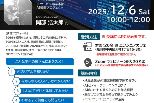 福岡未来創造プラットフォームでは、エンジニアカフェと共同で福岡未来創造プログラム「エンジニア天神クラス」を開講しています。 今回は福岡にいながら最前線で活躍する現役エンジニアを講師に迎え、AI開発のリアルを学ぶ実践的かつ初級レベルの講座です。 文系・理系に関係なく、エンジニア志望でなくても受講できます。 友人・知人や先輩・後輩をお誘い合わせのうえご参加ください。お一人での参加も大歓迎です! <こんな学生の皆さんにおすすめ!> 1.AIのリアルを知りたい 2.何から学んだらいいかわからない 3.はじめてだけど体験してみたい 4.わかるまで何度でも聞きたい 5.エンジニアと繋がりを作りたい ◆概 要◆ 【テーマ】話題のAIを学んでみよう!AIプログラミング実践講座 【講 師】SCSK九州株式会社 岡部 浩太郎 氏 (本学工学部 機械工学科卒業) 【日 時】12月6日(土)10:00~12:00 【会 場】エンジニアカフェ(福岡市中央区天神1-15-30) 【定 員】対面受講20名 【対 象】福岡県内の大学等に通学する学生 【受講料】無料 【持ち物】受講にはPCが必要です 【詳細・お申込み】こちらのサイトをご覧ください 【お問合せ先】 福岡工業大学 社会連携センター E-mail:ccc-office@fit.ac.jp ★チラシはこちらをご覧ください。
