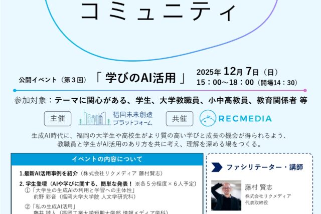 「福岡未来創造プラットフォーム」の主催で「学生の学び×AI活用」をテーマとしたイベントを開催します。 生成AIの登場により、学生の学びやキャリアをめぐる状況は大きな変革期を迎えています。 本イベントでは、福岡県内の大学の学生と教職員、高校を初めとした教育関係者が集まり、「生成AI時代の学びと成長のあり方」についてカジュアルな議論を通して一緒に考えます。 公開イベント第3弾となる今回は、多様な大学の学生が登壇し、いま生成AIにどのように向き合っているのか・活用しているのかについてお話します。その上で、生成AIが学生の学びや成長、生き方の可能性をどのように広げるかについてみんなで考えます。 学び×生成AIのテーマに関心がある方・理解を深めたい方、生成AIの活用を考えたい方、生成AIの活用をめぐる課題や可能性に興味がある方など、どなたでも大歓迎です。 生成AIに関する事前の知識や経験は必要ありませんので、お気軽にご参加ください。 学び×生成AIの「いま」と「未来」について一緒に考えましょう! 【福岡教育AI活用推進コミュニティ(Fukuoka Education AI)とは】 生成AI時代に、福岡の大学生や高校生がより質の高い学びと成長の機会が得られるよう、教職員と学生がAI活用のあり方を共に考え、理解を深めたり、実践へと繋げていくことを目的としています。 福岡未来創造プラットフォームと株式会社リクメディアの共同企画のもと、教育・学び×AI活用をテーマとした多彩なイベントを定期開催していきます。 ◆概 要◆ 【日 程】2025年12月7日(日) 15:00~18:00(開場14:30) 【会 場】福岡大学 60周年記念館(ヘリオスプラザ)2階 地域交流サロン 【定 員】最大40名程度 【参加費】無料 【対 象】テーマに関心がある大学の教員・職員・学生、および高校教員をはじめとした教育関係者 【主 催】福岡未来創造プラットフォーム 【共 催】株式会社リクメディア 【締 切】12月6日(土)18:00 【申 込】こちらのフォームからお申し込みください。 ◆チラシはこちらをご覧ください。 ◆詳細はこちらのサイトをご覧ください。 【お問合せ先】 福岡大学 社会連携センター Mail:koyu@adm.fukuoka-u.ac.jp