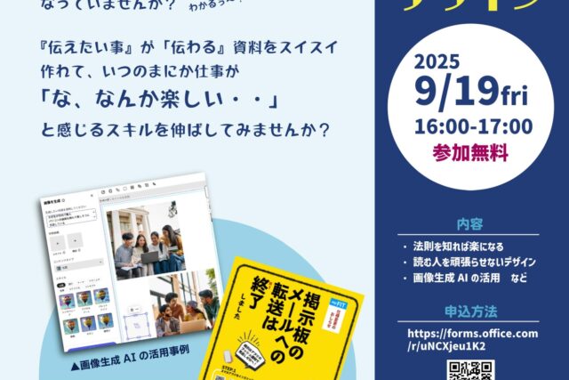 本学が加盟し、産学官15機関で構成される「福岡未来創造プラットフォーム」では、加盟機関の教職員を対象に、共同SD研修としてIT系講座を開催いたします。 「読みたいデザイン」をテーマとして、プレゼンテーション資料やポスター作成など、日常業務で多くの時間と労力を要する作業をより効果的かつ効率的に行うためのヒントをお届けします。 講師自身の業務での試行錯誤や工夫の経験を踏まえ、伝わる文章の書き方、デザインの工夫、さらに注目を集める画像生成AIの活用法 についてご紹介いたします。 実務にすぐ役立つ内容となっておりますので、この機会にぜひご参加ください。 ◆概 要◆ 【日 時】9月19日(金)16:00~17:00 【会 場】オンライン(Teams) 【講 師】福岡工業大学 情報基盤センター 只松 美恵子 氏 【対 象】福岡未来創造プラットフォーム加盟機関の教職員 【申 込】こちらのフォームからお申し込みください。 ★チラシはこちらをご覧ください。 ★詳細はこちらをご覧ください。 【お問合せ先】 福岡工業大学 情報基盤センター E-mail:center@fit.ac.jp