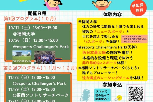 本学では、地域スポーツや健康づくりに関する課題の解決に向けて、自治体、企業、地域スポーツ団体と連携し、 「福岡大学スポーツ・健康まちづくりコンソーシアム」 (略称:FUスポまちコンソーシアム)を設立し、さまざまな事業に取り組んでいます。 今年度は、リアルスポーツとeスポーツの融合による多世代・多様な体験機会を創出し、マルチスポーツの普及・振興モデルの構築に、 FUスポまち参画団体の地元プロスポーツチーム、自治体、企業と連携して取り組みます。 今回は第一弾として、多世代型マルチスポーツ体験講座を開催します。 この機会に様々な方々と一緒にeスポーツ、ニュースポーツを体験してみませんか? 年齢、性別、障がいの有無にかかわらず、どなたでも参加できます。 本講座は2回のプログラム構成となっており、どちらか一方のプログラム、または両方参加も可能です。 参加をご希望の方は、申込フォームよりお申込みをお願いいたします。(先着順) 詳細は下記及びチラシをご覧いただき、ご興味のある方はぜひ体験会にお越しください。 参加費は無料ですので、どなたでも気軽にご参加いただけます。 今話題のeスポーツと、年代問わず楽しめるやさしいスポーツであるニュースポーツを一度に体験できる貴重な機会です。 ぜひ奮ってご参加ください! ■開催概要 ---------------------------------------------------------------------------------------------------------- ■第1回プログラム(2日間通しての参加プログラム) 〇10月11日(土) 時 間:13:00~15:00 内 容:eスポーツ体験+ニュースポーツ 会 場:福岡大学ヘリオスプラザ・サッカー場 〇10月26日(日) 時 間:13:00~15:00 内 容:eスポーツ体験 会 場:esports Challenger's Park(福岡市中央区渡辺通4丁目9-25 Luz福岡8階) ※駐車場なし ■第2回プログラム(3日間通しての参加プログラム) 〇11月23日(日) 時 間:13:00~15:00 内 容:eスポーツ体験 会 場:esports Challenger's Park(福岡市中央区渡辺通4丁目9-25 Luz福岡8階) ※駐車場なし 〇11月29日(土) 時 間:13:00~15:00 内 容:eスポーツ体験(レーシングゲーム体験あり) 会 場:福岡ソフトリサーチパーク(福岡市早良区百道浜2丁目1-22) 〇12月14日(日) 時 間:13:00~15:00 内 容:eスポーツ体験+ニュースポーツ 会 場:福岡大学ヘリオスプラザ・サッカー場 --------------------------------------------------------------------------------------------------------------------- ■定 員:各プログラム40名(先着順) ■対 象:小学生・中学生・高校生・大学生・社会人(初心者・親子参加も大歓迎!) ■参加費:無料 ■申 込:こちらのフォームからお申し込みください。 ※本事業はスポーツ庁及びUNIVASの委託事業である「令和7年度感動する大学スポーツ総合支援事業(大学スポーツ資源を活用した地域振興モデル創出支援事業)」によるものです。 主催:福岡大学 協力:福岡eスポーツ協会、株式会社QTnet、株式会社戦国
