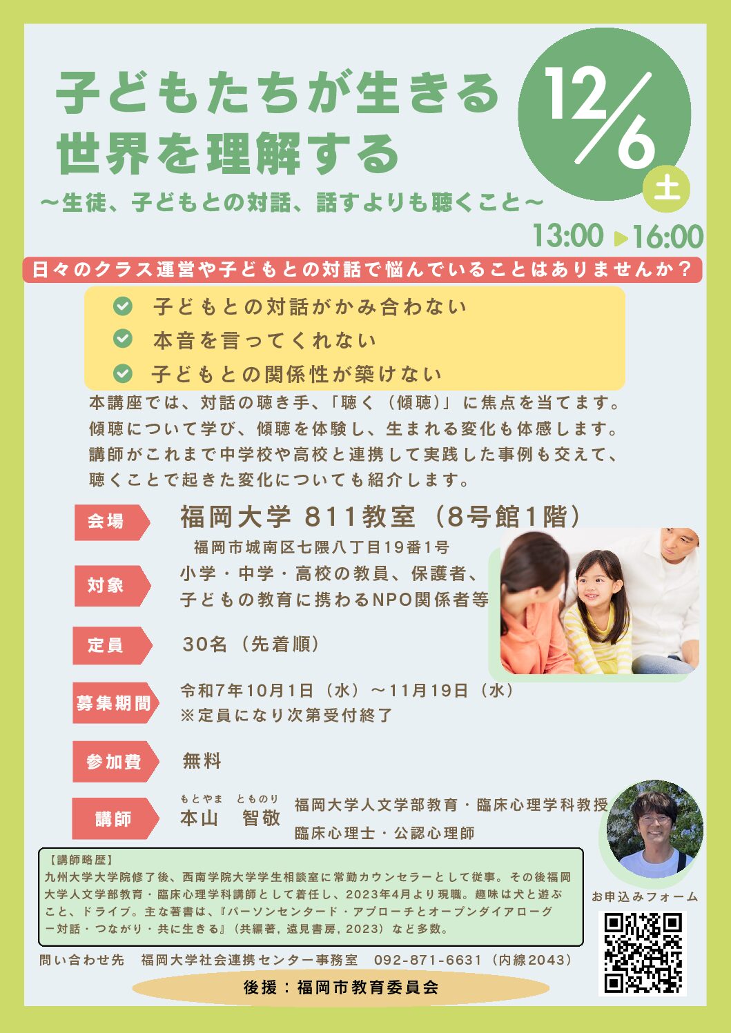 小学校・中学校・特別支援学校・高等学校の教員を対象に、「子どもたちが生きる世界を理解する~生徒、子どもとの対話、話すよりも聴くこと~」と題した市民カレッジ講座を実施します。 この講座は、小学校・中学校・特別支援学校・高等学校の多感な時期を過ごす子どもたちとの対話や日々のクラス運営に悩む先生方に向けて、「聴く(傾聴)」に焦点を当てて、傾聴について学び、傾聴を体験し、生まれる変化を体験することで、子どもたちの良き支援者となるよう共に考えることを目的と しています。 これらの学びは、小学校・中学校・特別支援学校・高等学校で実施されるキャリア教育にも資する内容となっています。 日時:令和7年12月6日(土) 13:00~16:00 会場:福岡大学831教室(8号館1階) 対象:小学・中学・高校の教員、保護者、子どもの教育に携わるNPO関係者等 定員:30名(先着順) 募集期間:令和7年10月1日(水)~11月19日(水) 参加費:無料 講師:福岡大学人文学部教育・臨床心理学科教授、臨床心理士・公認心理士 本山 智敬 チラシのQRコードより、お申込みください。 【R7.12.6開催】福岡大学市民カレッジ講座チラシ