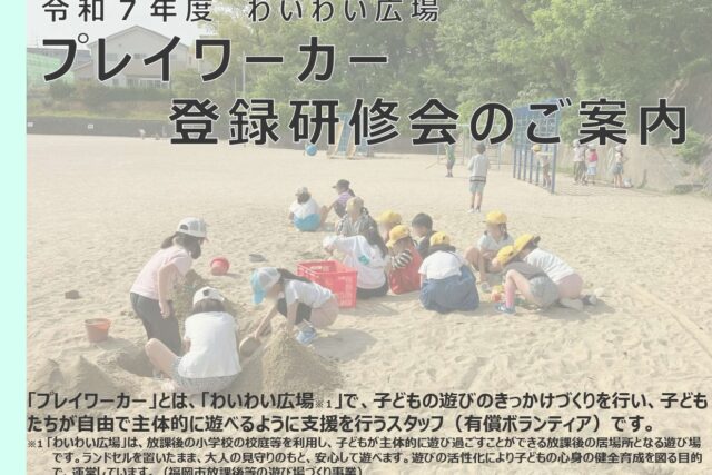 福岡市教育委員会が実施する「わいわい広場」では、子どもたちが放課後に自由で主体的に遊べる場づくりを行っています。 このたび、この活動を支えるスタッフ「プレイワーカー」の育成を目的とした登録研修会が開催されます。 子どもたちの成長を支えるやりがいのある活動に、ぜひ参加してみませんか? 皆さまのお申込みをお待ちしております! なお、本学が加盟し、産学官15機関で構成される福岡未来創造プラットフォームでは、「プレイワーカー」の育成と「わいわい広場」について、協力して実施いたします。 ◆「プレイワーカー」とは◆ 「わいわい広場」を支援するスタッフです。登録研修の受講をもって「プレイワーカー」と認められ、「わいわい広場」で活動した時間に応じて、謝金が支払われます。 ◆概 要◆ 【日 時】10月4日(土)10:00~12:00 【会 場】エイムアテイン博多駅前貸会議室(福岡市博多区博多駅前3-25-24 八百治ビル5階) 【締 切】9月19日(金) 【申 込】こちらのフォームからお申し込みください。 ★チラシはこちらをご覧ください。 【お問合せ先】 麻生教育サービス株式会社(運営) E-mail:waiwai@aso-education.co.jp
