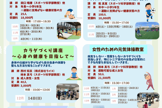 福岡大学社会連携センターでは、市民の方々のための生涯学習事業として「福岡大学市民カレッジ」を開講します。 市民の方々がスポーツに親しみ、健やかな生活を送るための5 つの講座を準備しており、女性、幼児、小中学生を対象とした講座もあります。 後期は、「キッズ体操教室」「キッズ・サッカークラブ」「カラダづくり講座」「女性のための元気体操教室」「剣道部公開講座」を開講します。 詳細は福岡大学市民カレッジウェブサイトからご確認ください。 お申込みはこちら(福岡大学市民カレッジ予約サイト)